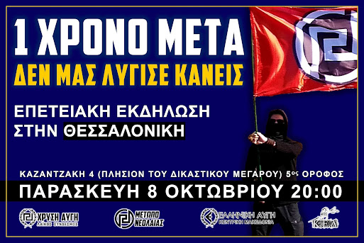 Ένα χρόνο μετά την αηθή και αβάσιμη καταδίκη του Αρχηγού μας και των Συναγωνιστών μας οι Έλληνες Εθνικιστές αποδεικνύουμε ότι ΔΕΝ ΜΑΣ ΛΥΓΙΖΕΙ ΤΙΠΟΤΑ, συνεχίζουμε ακλόνητοι τον Αγώνα για Εθνική Ελευθερία και απαιτούμε την Δικαίωση των πολιτικών κρατουμένων της Χρυσής Αυγής. Στο πλαίσιο αυτό θα πραγματοποιηθεί αυτή την Παρασκευή ανοιχτή δυναμική εκδήλωση στην Θεσσαλονίκη, στις εγκαταστάσεις του Εθνικιστικού Πολυχώρου “ΣΑΡΙΣΑ” και της Τ.Ο. Θεσσαλονίκης.