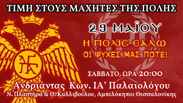 Tο Σάββατο, 29/05 και ώρα 20:00, θα πραγματοποιηθεί στην Θεσσαλονίκη τελετή Τιμής και Μνήμης για τον τελευταίο Αυτοκράτορα, Κωνσταντίνο Παλαιολόγο και τους υπερασπιστές της Κωνσταντινούπολης. Καλούνται όλοι οι φίλοι του Λαϊκού Εθνικιστικού Κινήματος να δώσουν το παρών!