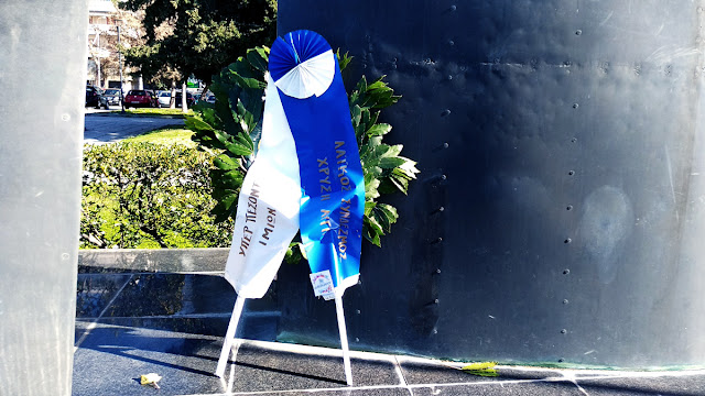 Κατατέθηκε στεφάνι εκ μέρους του πολιτικού κρατουμένου, και Αρχηγού του Κινήματος μας, Νικολάου Μιχαλολιάκου, ακολούθησε μια σύντομη ομιλία εκπροσώπου του Μετώπου Νεολαίας και τέλος άπαντες οι συναγωνιστές έψαλλαν σε στάση προσοχής τον Εθνικό Ύμνο και τον Ύμνο της Χρυσής Αυγής.