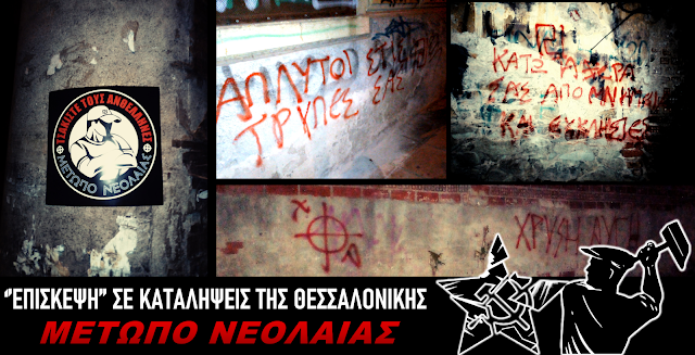 Προ ολίγων ημερών οι γνωστοί παρακρατικοί της πόλης φρόντισαν να δείξουν για ακόμα μια φορά το σιχαμερό ποιόν τους βανδαλίζοντας έναν Ιερό Ναό της Θεσσαλονίκης με πάνω από 6 αιώνες ιστορία και αξία αναγνωρισμένη από την Unesco! Αντίστοιχα περιστατικά έχουν σημειωθεί σε όλη την Ελλάδα, συχνά με την “συνδρομή” ισλαμιστών εισβολέων. Ως απάντηση σε αυτή την απεχθή πράξη και τα γελοία συνθήματα των δραστών μέλη του Μετώπου Νεολαίας συνόδευσαν την… προσωπική τους άσκηση με εξορμήσεις προς διάφορες παράνομες καταλήψεις και παρακμιακά στέκια.