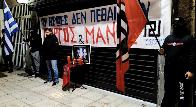 Με μια λιτή αλλά έντονα φορτισμένη τελετή νέοι και παλαιότεροι Συναγωνιστές, παρά τον βροχερό καιρό, συγκεντρωθήκαμε όλοι μαζί μπροστά στην πλαισιωμένη από τα λάβαρα μας εικόνα του Γίωργου και του Μάνου που δολοφονήθηκαν άνανδρα από μισούντες την Εθνικιστική ανδρεία παρακρατικούς.