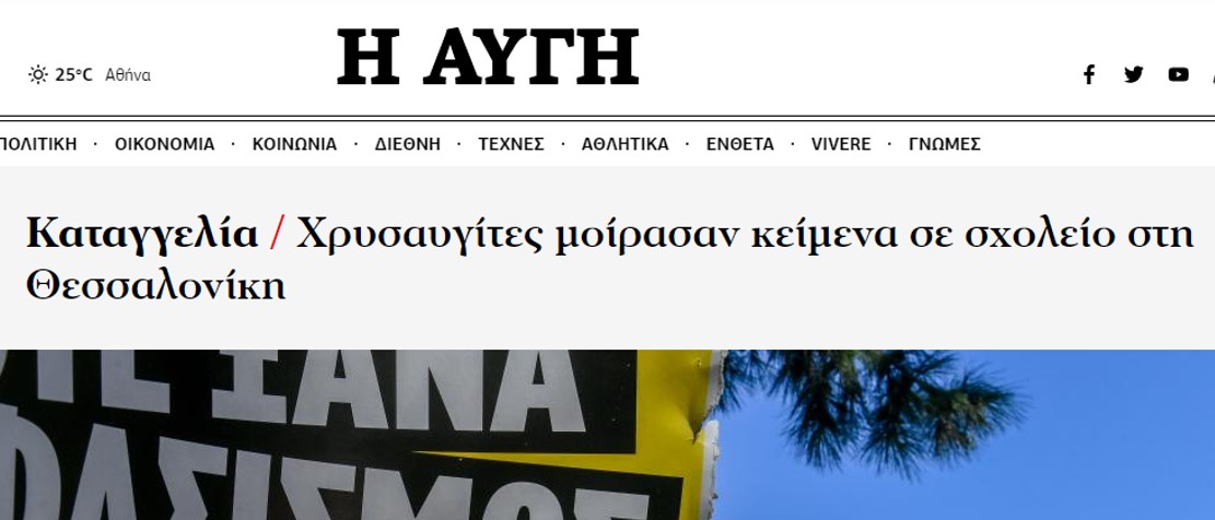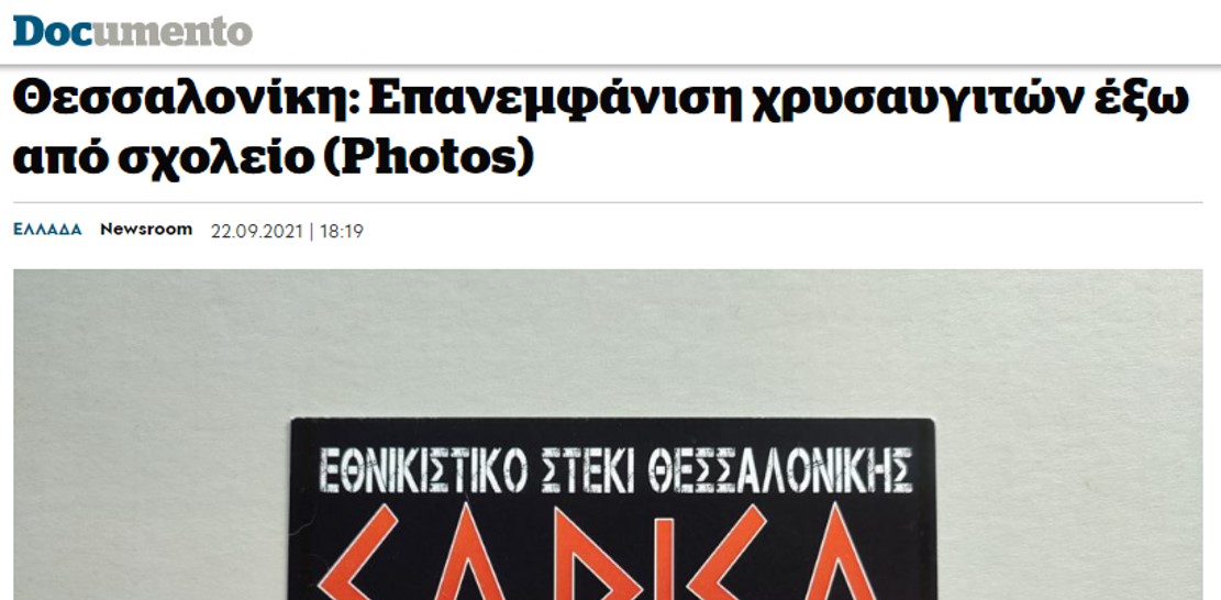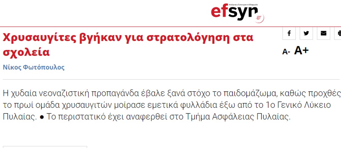 Μέσα στην βδομάδα κλιμάκια του Μετώπου Νεολαίας πραγματοποίησαν πρωινές ενημερωτικές εξορμήσεις σε περιοχές της ανατολικής Θεσσαλονίκης. Όπως ήταν φυσικό πλησίον των τοπικών Λυκείων οι Συναγωνιστές συνάντησαν πολλούς μαθητές που με ενδιαφέρον έλαβαν το ενημερωτικό μας υλικό. Μάλιστα αρκετοί από αυτούς στάθηκαν και για να συζητήσουν με τους νέους της Χρυσής Αυγής, παρά τα επικριτικά βλέμματα και τις μετέπειτα απόπειρες εκφοβισμού κάποιον μεμονωμένων απαράδεκτων καθηγητών (για τις οποίες ενημερωθήκαμε άμεσα).