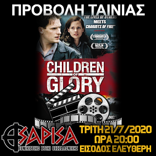 Το βράδυ της Τρίτης 21 Ιουλίου πραγματοποιήθηκε προβολή της ιστορικής ταινίας “Children of Glory”, στον Εθνικιστικό πολυχώρο “ΣΑΡΙΣΑ”. Πρόκειται για μια από τις ελάχιστες παραγωγές που προβάλλουν την ιστορία της Ουγγρικής Επαναστάσεως του 1956. Η πλοκή ακολουθεί την “μετάλλαξη” ενός ανθρώπου, φαινομενικά βολεμένου από το σοβιετικό καθεστώς, από πειθήνιο όργανο των τυράννων σε υποστηρικτή και μαχητή της Επανάστασης.