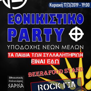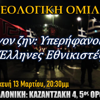 Την Παρασκευή 13 Μαρτίου 2020, ώρα 20:30, στην Τ.Ο. Θεσσαλονίκης και στα πλαίσια της λειτουργίας του Εθνικιστικού Πολυχώρου ΣΑΡΙΣΑ θα πραγματοποιηθεί ομιλία του Συναγωνιστή Νάκου Φώτη με θέμα «Λόγον ζην: Υπερήφανοι ως Έλληνες Εθνικιστές»....