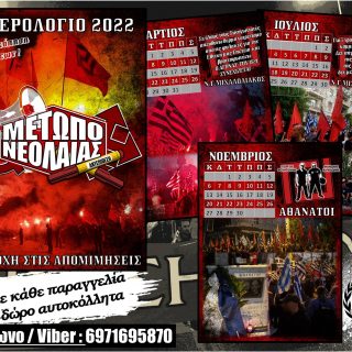 Τώρα διαθέσιμο το ημερολόγιο του Κινήματος για το έτος 2022! Με πρωτοβουλία του Μετώπου Νεολαίας, το ημερολόγιο της φετινής χρονιάς απαντά σε όσους ευχήθηκαν το “τέλος” της ΧΡΥΣΗΣ ΑΥΓΗΣ με εκτενές φωτορεπορτάζ δράσεων από...