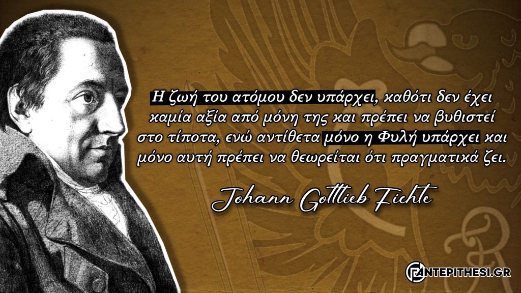 Στο σημείο αυτό αξίζει να επισημανθεί ότι η ίδρυση του νεοελληνικού κράτους πραγματοποιήθηκε βασιζόμενη στις διακηρύξεις του Fichte περί του «Δικαίου του Αίματος», ενώ η άποψή του ότι «Η ζωή του ατόμου δεν υπάρχει, καθότι δεν έχει καμία αξία από μόνη της και πρέπει να βυθιστεί στο τίποτα, ενώ αντίθετα μόνο η Φυλή υπάρχει και μόνο αυτή πρέπει να θεωρείται ότι πραγματικά ζει», είναι πολύ χαρακτηριστική τόσο της κοσμοθέασης, όσο και των πολιτικών του πεποιθήσεων, καθώς μέσα από αυτήν εκφράζει με ιδιαίτερη σαφήνεια την σχέση μεταξύ του ατόμου και της φυλής. Η φυλή είναι η μόνη που ζει αιώνια, ενώ τα άτομα αποτελούν στιγμιαίες εκφάνσεις της που θα παρέλθουν. Αυτό σημαίνει πως το άτομο οφείλει να ζει για την φυλή του και όχι να δρα εγωιστικά, το οφείλει ως ένας αναπόσπαστος κρίκος στην αλυσίδα των γενεών, γεγονός το οποίο αυτομάτως συνεπάγεται την σύνδεσή του με ανώτερες αξίες και ιδανικά, όπως είναι η φιλοπατρία, η γενναιότητα και η αυτοθυσία.