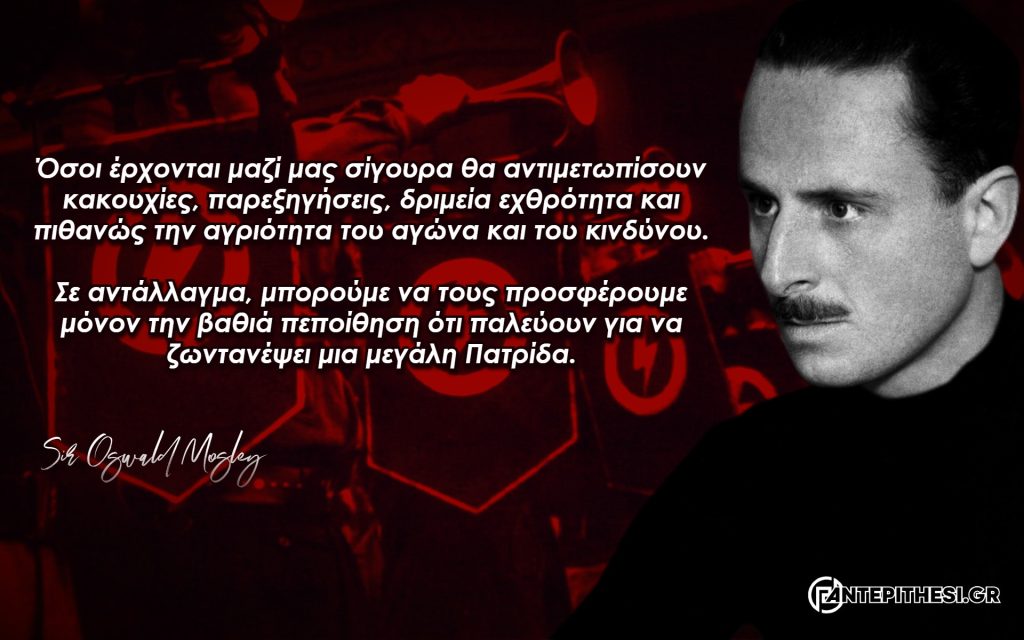 Ο Oswald Mosley υπήρξε μια από τις σημαντικότερες φυσιογνωμίες του Φασισμού και σημάδεψε με την δράση, τους αγώνες και τις ιδέες του όλα τα μεταπολεμικά ευρωπαϊκά ριζοσπαστικά κινήματα, καθώς υπήρξε ο κήρυκας της αναγέννησης και της ενότητας της Μεγάλης Ευρώπης. Γεννηθείς τον Νοέμβριο του 1896, ο Oswald Mosley ήταν γόνος μιας παλιάς αριστοκρατικής οικογένειας από την κομητεία Staffordshire της Αγγλίας. Ενώ ήταν ακόμα δόκιμος στην Στρατιωτική Σχολή του Sandherst, λαμβάνει μέρος στον Α’ Παγκόσμιο Πόλεμο και γρήγορα εντάσσεται στην νεοσύστατη αεροπορία ως πιλότος αναγνώρισης, βιώνοντας στο μεταξύ και έναν σοβαρότατο τραυματισμό το 1915. Ακολούθησε μια πολύχρονη πολιτική καριέρα, αν και σε μερικά χρόνια έμελλε να εκπαραθυρωθεί από το αστικό πολιτικό σύστημα της χώρας του.