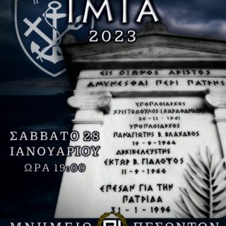 Τιμή στους τρεις πεσόντες Αξιωματικούς του Πολεμικού Ναυτικού, οι οποίοι γράφτηκαν με χρυσά γράμματα στο βιβλίο των Ελλήνων Ηρώων υπερασπιζόμενοι την Πατρίδα. Μνήμη για την προδοσία του χυμένου αίματός τους από τους πολιτικούς της...