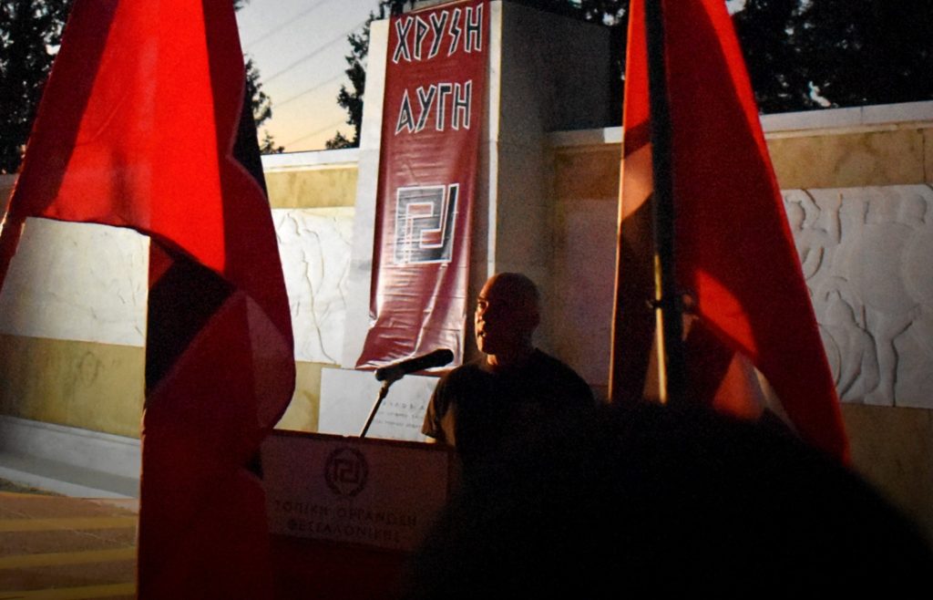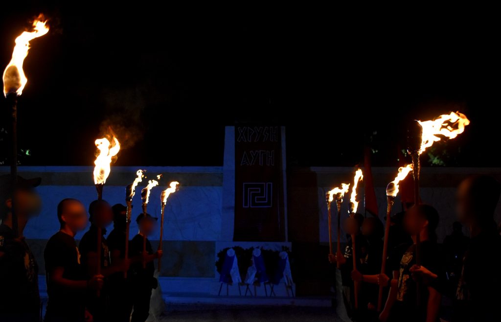 Καθώς ο ήλιος δύει, η μαυροφορεμένη παράταξη λαμβάνει θέση και η ατμόσφαιρα αρχίζει να δονείται από εθνικιστικά εμβατήρια και συνθήματα. Η εκδήλωση ξεκινά με τον εκπρόσωπο της Τ.Ο. Αθηνών στο βήμα, ακολουθούν ο Συναγωνιστής του Μετώπου Νεολαίας που αναλαμβάνει την ιστορική αφήγηση της μάχης, ο Συναγωνιστής Κ. Τσαπακίδης από την Τ.Ο. Δράμας, εκπροσωπώντας την Κεντρική Επιτροπή του Λαϊκού Συνδέσμου, και ο χαιρετισμός του εκπροσώπου της Τ.Ο. Θεσσαλονίκης. Ομιλίες συχνά λακωνικές αλλά γεμάτες παλμό, όπως αρμόζει σε Χρυσαυγίτες, μακριά από αστικές μεμψιμοιρίες και φληνάφημα.